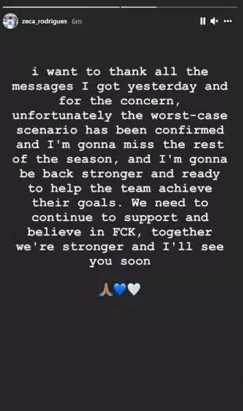 To post του Ζέκα στα social media αναφέρει: «Θέλω να σας ευχαριστήσω για τα μηνύματα που έλαβα. Δυστυχώς επιβεβαιώθηκε το χειρότερο σενάριο και θα χάσω το υπόλοιπο της σεζόν. Θα επιστρέψω όμως πιο δυνατός από ποτέ και έτοιμος να βοηθήσω την ομάδα μου να πετύχει τους στόχους της».