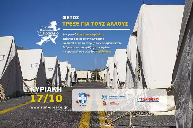 Στις 17 Οκτωβρίου τρέχουμε στο Ηράκλειο για την υγεία μας, για καλύτερη ζωή, τρέχουμε όμως και κυρίως δηλώνουμε τη συμμετοχή μας για να βοηθήσουμε με άμεσο τρόπο το πληγωμένο Αρκαλοχώρι. Τα κρητικά Super Market Χαλκιαδάκης, θέλοντας εκτός από τη στήριξη των σεισμόπληκτων και την προώθηση της υγιεινής και καλύτερης ζωής να δώσουν και ενεργό μήνυμα για μείωση του πλαστικού μιας χρήσης, επιβραβεύουν κάθε συμμετέχοντα προσφέροντας και μια υφασμάτινη τσάντα πολλαπλών χρήσεων. Υγεία, καλύτερη ζωή, σεβασμός στο περιβάλλον και κυρίως φροντίδα για τους συνανθρώπους μας, όλα σε μία πράξη, τη συμμετοχή στο Run Greece!