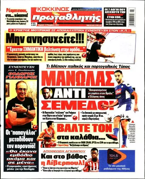 HOT NEWS ΜΑΤΣΑΡΑ ΡΩΜΑΝΟΣ-ΧΕΡΣΟΝΗΣΟΣ ΑΠΟΤΕΛΕΣΜΑΤΑ ΣΑΒΒΑΤΟΥ ΜΕΓΑΛΟ ΔΙΠΛΟ ΑΝΘΕΣΤΙΩΝ ΝΙΚΗ Κ15 ΟΦΗ ΕΦΗΜΕΡΙΔΕΣΚΥΡΙΕΣ ΕΙΔΗΣΕΙΣ Τα αθλητικά πρωτοσέλιδα της Κυριακής 14/11 Κώστας Παπαδόπουλος 14/11/2021 - 09:15 FacebookTwitterWhatsAppLinkedinEmailΤυπώνωCopy URL Διαβάστε όσα γράφουν τα πρωτοσέλιδα των αθλητικών εφημερίδων σε Αθήνα και Θεσσαλονίκη. ΔΙΑΒΑΣΤΕ ΕΠΙΣΗΣ: Μικτή Κ16: Οι κλήσεις για το φιλικό με την Κ17 του ΟΦΗ Οι κλήσεις της Μικτής Κ14 ΕΠΣΗ ΠΟΑ-Γιούχτας: LIVE Τα αποτελέσματα του Σαββάτου (18/10) και το πρόγραμμα της Κυριακής (19/10) LIVE οι αγώνες της Κυριακής (19/10) Α1 ΕΠΣΗ: Ματσάρα χωρίς νικητή στην Ελιά, μεγάλο διπλό Ανθεστίων, «τσίμπησε» κι άλλο βαθμό το Λίντο ΡΟΗ ΕΙΔΗΣΕΩΝ ΜΙΚΤΕΣ Μικτή Κ16: Οι κλήσεις για το φιλικό με την Κ17 του ΟΦΗ Δημήτρης Γιγουρτσής 19/10/2025 15:52 ΜΙΚΤΕΣ Οι κλήσεις της Μικτής Κ14 ΕΠΣΗ Πολυχρόνης Αγγελάκης 19/10/2025 15:47 ΠΟΑ ΠΟΑ-Γιούχτας: LIVE Δημήτρης Γιγουρτσής 19/10/2025 15:35 ΠΟΑ ΠΟΑ-Γιούχτας: Οι 11αδες στο ντέρμπι της Γ’ Εθνικής Δημήτρης Γιγουρτσής 19/10/2025 15:25 LIVE LIVE οι αγώνες της Κυριακής (19/10) Δημοσιογραφικό Τμήμα 19/10/2025 15:20 ΔΟΞΑ ΓΑΛΙΑΣ Θ. Αντωνάκης: «Πολλά συγχαρητήρια στους παίκτες» Πολυχρόνης Αγγελάκης 19/10/2025 14:52 Β ΕΠΣΗ B1 ΕΠΣΗ: Nίκες με μεγάλα σκορ για Κόροιβο και Δόξα Γαλιάς Μάνος Φουστανάκης 19/10/2025 14:47 Όλες οι ειδήσεις ΔΗΜΟΦΙΛΗ Α1 ΕΠΣΗ Τα αποτελέσματα του Σαββάτου (18/10) και το πρόγραμμα της Κυριακής (19/10) LIVE LIVE οι αγώνες της Κυριακής (19/10) Α1 ΕΠΣΗ Α1 ΕΠΣΗ: Ματσάρα χωρίς νικητή στην Ελιά, μεγάλο διπλό Ανθεστίων, «τσίμπησε» κι άλλο βαθμό το Λίντο ΑΝΘΕΣΤΙΩΝ Θρίαμβος του Ανθεστίωνα στο Γάζι, 0-3 τον Αλμυρό! ΡΩΜΑΝΟΣ Φοβερή ματσάρα και ισοπαλία για Ρωμανό και Χερσόνησο