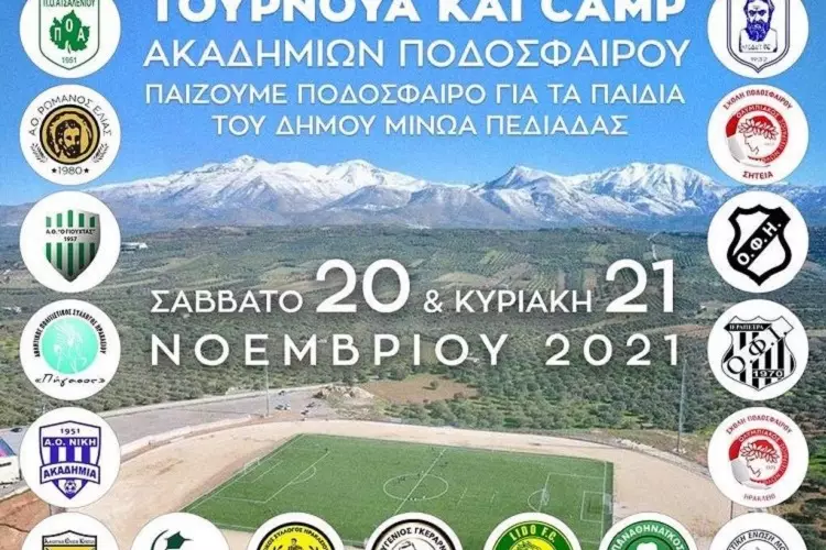 «ΤΟΥΡΝΟΥΑ ΚΑΙ CAMP ΑΚΑΔΗΜΙΩΝ ΠΟΔΟΣΦΑΙΡΟΥ στις Αρχάνες! Παίζουμε ποδόσφαιρο για τα παιδιά του Δήμου Μινώα Πεδιάδας με τη συμμετοχή ακαδημιών από όλη την Κρήτη! Το τουρνουά θα λάβει χώρα το Σάββατο 20/11 και την Κυριακή 21/11, να είστε όλοι εκεί!».