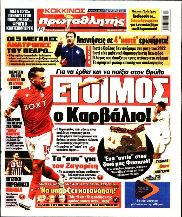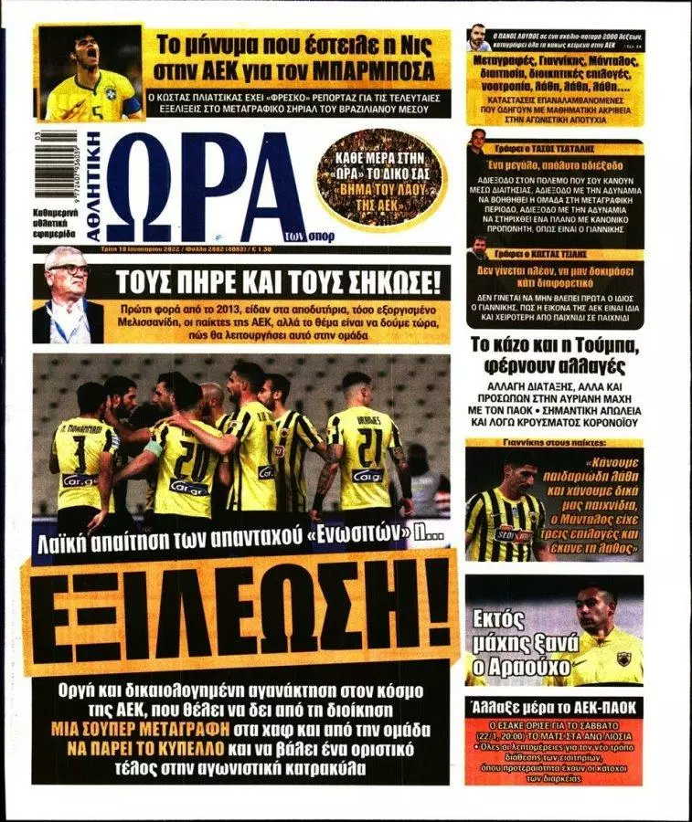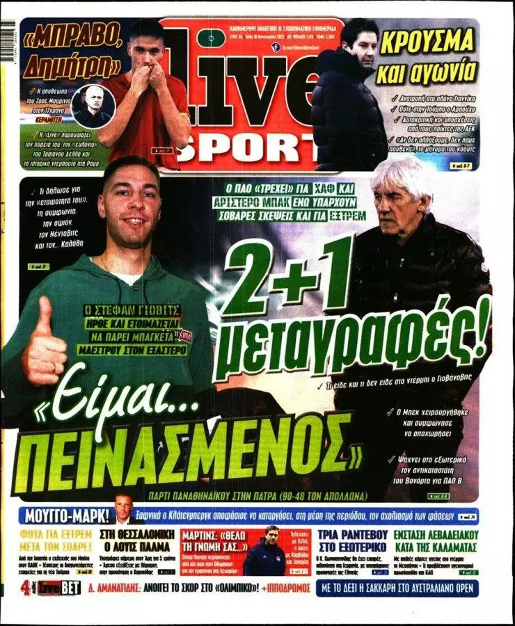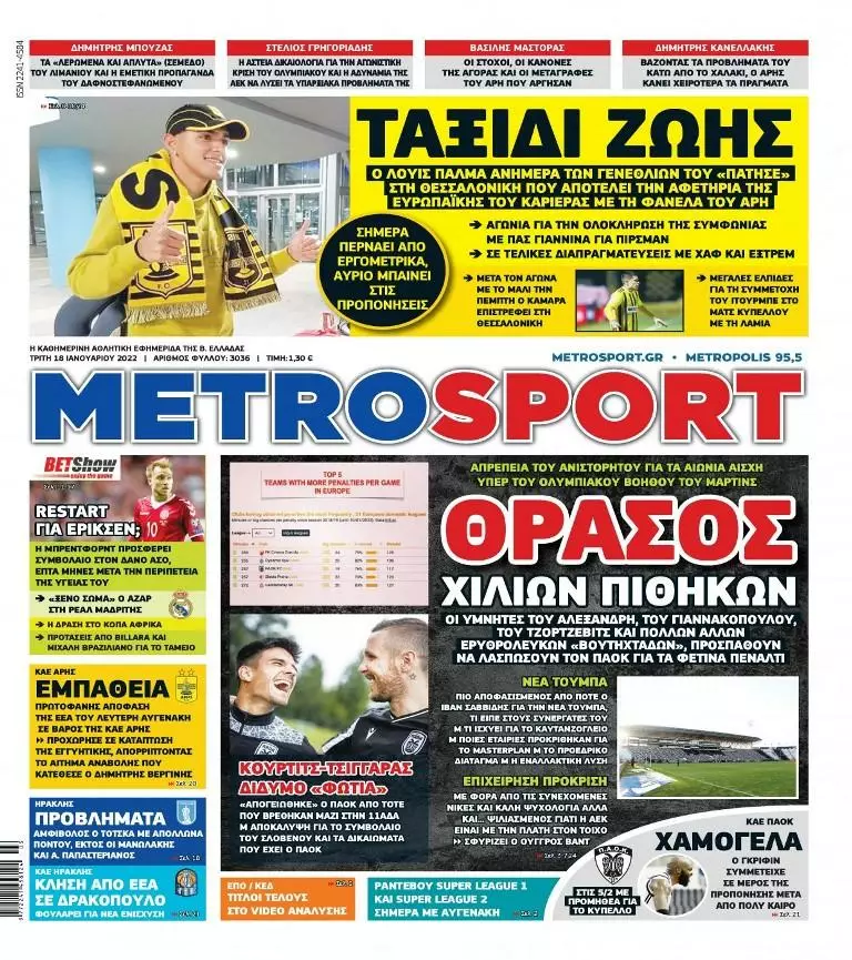 HOT NEWS ΑΝΑΒΟΛΕΣ ΑΓΩΝΩΝ ΔΙΑΙΤΗΤΕΣ ΣΑΒΒΑΤΟΚΥΡΙΑΚΟΥ ΟΡΙΣΜΟΣ ΕΞ' ΑΝΑΒΟΛΗΣ ΕΠΣΗ ΑΠΟΣΤΟΛΗ ΟΦΗ ΓΙΑ ΠΑΝΑΙΤΩΛΙΚΟ ΤΣΙΜΠΙΝΟΣ MVP ΕΦΗΜΕΡΙΔΕΣΚΥΡΙΕΣ ΕΙΔΗΣΕΙΣ Τα πρωτοσέλιδα των αθλητικών εφημερίδων(18/01) Δημοσιογραφικό Τμήμα 18/01/2022 - 09:02 FacebookTwitterWhatsAppLinkedinEmailΤυπώνωCopy URL Δείτε τα πρωτοσέλιδα των αθλητικών εφημερίδων για σήμερα Τρίτη 18 Ιανουαρίου του 2022. ΔΙΑΒΑΣΤΕ ΕΠΙΣΗΣ: Ηττήθηκε από τον Παναιτωλικό η Κ17 του ΟΦΗ Δ. Στεφανάκης: «Ο καθένας ατομικά και όλοι μαζί για τον Εργοτέλη!» Ν. Ρούκα: «Τιμή μου να φοράω τη βαριά φανέλα του ΠΑΝΟΜ» ΕΠΣΗ: Οι παρατηρητές στους αγώνες του σαββατοκύριακου (18-19/10) Α1 ΕΠΣΗ: Ανοίγει η αυλαία της αγωνιστικής με τρία παιχνίδια LIVE οι αγώνες του Σαββάτου (18/10) ΡΟΗ ΕΙΔΗΣΕΩΝ ΟΦΗ Ηττήθηκε από τον Παναιτωλικό η Κ17 του ΟΦΗ Δημήτρης Γιγουρτσής 18/10/2025 15:52 LIVE LIVE οι αγώνες του Σαββάτου (18/10) Δημήτρης Γιγουρτσής 18/10/2025 15:20 ΓΙΟΥΧΤΑΣ Με τρεις σοβαρές απουσίες η αποστολή του Γιούχτα για το Ατσαλένιο Δημήτρης Γιγουρτσής 18/10/2025 14:54 ΟΦΗ Οι παίκτες της Κ17 ΟΦΗ που έχουν δικαίωμα συμμετοχής στην Μικτή Κ16 ΕΠΣΗ Δημήτρης Γιγουρτσής 18/10/2025 14:45 ΕΡΓΟΤΕΛΗΣ Δ. Στεφανάκης: «Ο καθένας ατομικά και όλοι μαζί για τον Εργοτέλη!» Δημήτρης Γιγουρτσής 18/10/2025 14:29 ΠΑΝΟΜ Ν. Ρούκα: «Τιμή μου να φοράω τη βαριά φανέλα του ΠΑΝΟΜ» Μάνος Φουστανάκης 18/10/2025 14:03 ΑΝΘΕΣΤΙΩΝ Η. Ξυδάκης: «Να συνεχίσουμε να παρουσιάζουμε το ίδιο καλό πρόσωπο» Μάνος Φουστανάκης 18/10/2025 13:47 Όλες οι ειδήσεις ΔΗΜΟΦΙΛΗ ΕΠΣ - ΕΠΟ ΕΠΣΗ: Οι παρατηρητές στους αγώνες του σαββατοκύριακου (18-19/10) Α1 ΕΠΣΗ Α1 ΕΠΣΗ: Ανοίγει η αυλαία της αγωνιστικής με τρία παιχνίδια LIVE LIVE οι αγώνες του Σαββάτου (18/10) ΠΟΔΟΣΦΑΙΡΟ Με επιτυχία η επέμβαση στον Β. Κασαπάκη ΥΠΟΔΟΜΕΣ Νίκη για την Κ15 του ΟΦΗ με «χρυσή» αλλαγή τον Μ. Παναγιωτάκη