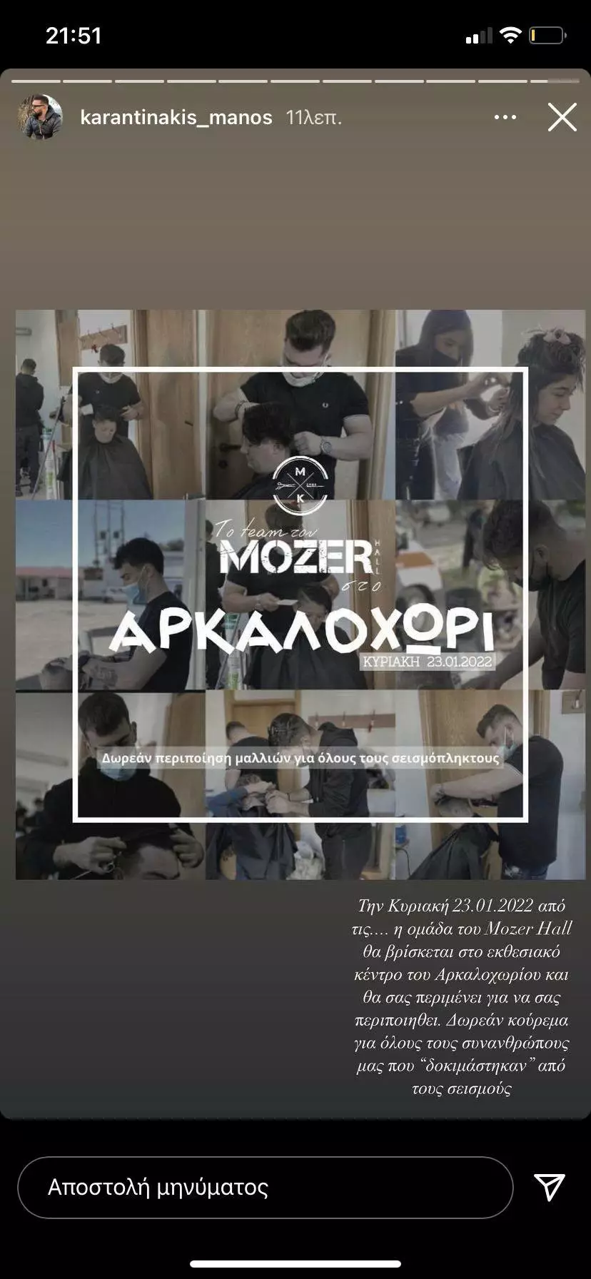 Την ερχόμενη Κυριακή (23/01), έτσι, η ομάδα του Mozer Hall θα μεταβεί στο Αρκαλοχώρι και θα προσφέρει δωρεάν κούρεμα σε σεισμόπληκτους της ευρύτερης περιοχής, που δοκιμάστηκαν από τον φονικό σεισμό της 27ης Σεπτεμβρίου 2021.