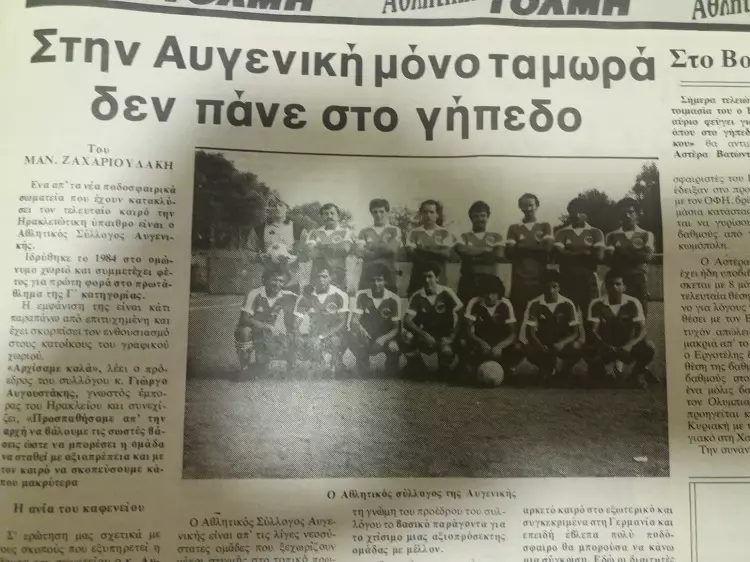 Η ανακοίνωση της Παλιανής: «Ας κάνουμε μια αναδρομή στο παρελθόν και την χρονιά του 1984. Είναι η χρονιά που φτιάχνετε η ομάδα του Αθλητικού Συλλόγου Αυγενικής. Αρκετοί παίκτες που αγωνιζόντουσαν στην ομάδα της Ασπίδας φεύγουν για να υπηρετήσουν την ομάδα του χωριού τους (Μπολάκης Αρ., Χελιδωνης Χ., Παυλάκης Θ., Βαρβεράκης Κ, Δρυγιαννάκης και άλλοι). Μόνη εξαίρεση ο Σταύρος Βρέντζος ο οποίος παραμένει για άλλη μια χρονιά στην ομάδα του Βενεράτου.