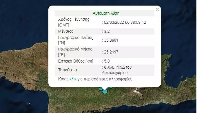 Νέα σεισμική δόνηση μεγέθους 3,2 Ρίχτερ σημειώθηκε πριν από λίγα λεπτά στο Αρκαλοχώρι.