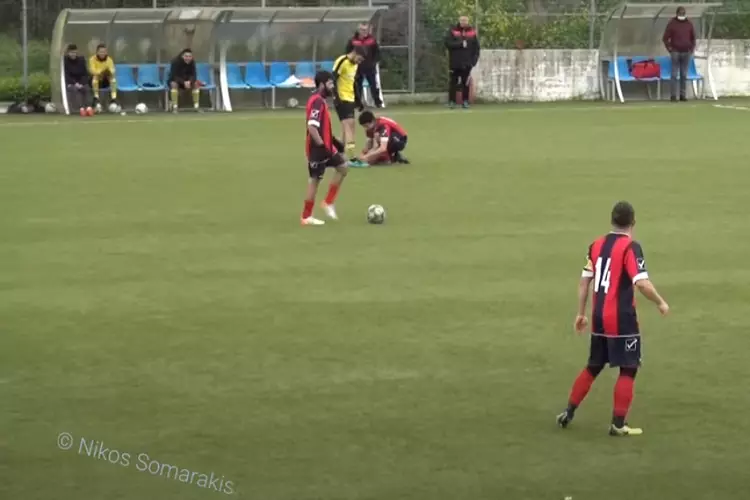 Πιο συγκεκριμένα ο ποδοσφαιριστής του Τηγανίτη Σοφουλάκης και ενώ η αναμέτρηση βρισκόταν σε εξέλιξη βοήθησε τον αντίπαλο ποδοσφαιριστή της Γαρίπας να δέσει τα κορδόνια του. Μάλιστα η μπάλα εκείνη την ώρα παιζόταν κανονικά στις τέσσερις γραμμές έχοντας και πορεία προς τους δύο παίκτες, οι οποίοι ωστόσο δεν κινήθηκαν πάνω σε αυτή.