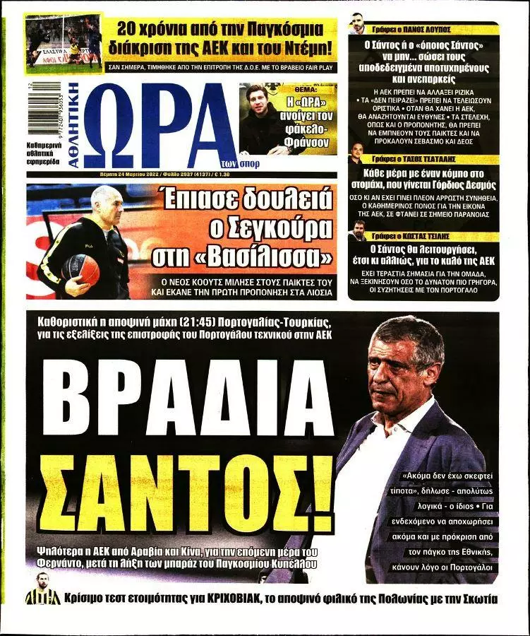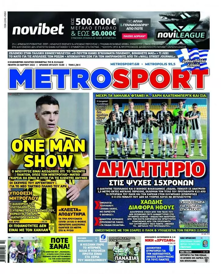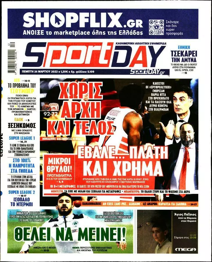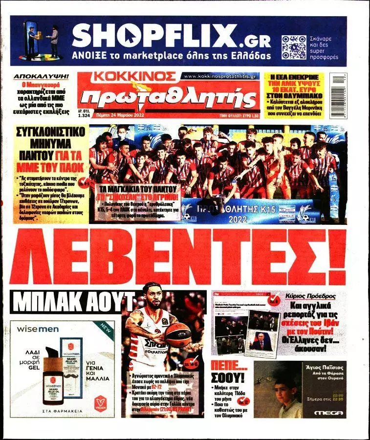 Δείτε τα πρωτοσέλιδα των αθλητικών εφημερίδων για σήμερα Πέμπτη 24 Μαρτίου του 2022.