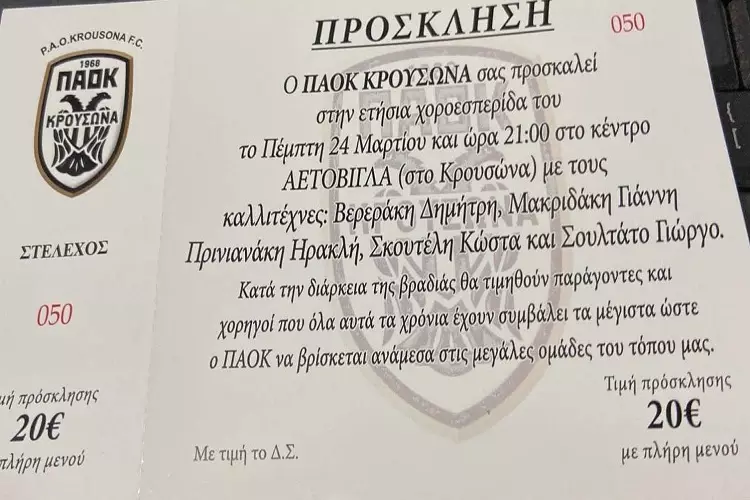 Χορηγός της σημαντικής αυτής βραδιάς για τον ΠΑΟΚ θα είναι η Creta Recycling του Δευκαλίων Στειακάκη, ενώ το μουσικό κομμάτι θα αναλάβουν οι καλλιτέχνες, Βερεράκης Δημήτρης, Μακριδάκης Γιάννης, Πρινιανάκης Ηρακλής, Σκουτέλης Κώστας και Σουλτάτος Γιώργος.