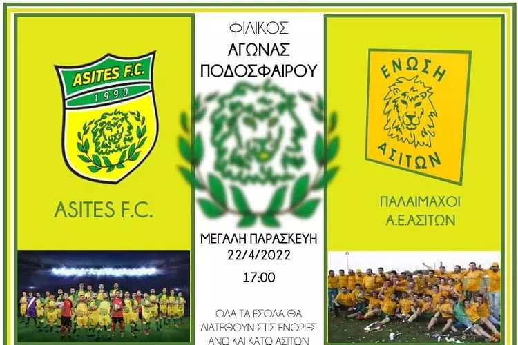 Πιο συγκεκριμένα το απόγευμα της Μ. Παρασκευής (17:00) θα πραγματοποιηθεί φιλικό παιχνίδι ανάμεσα στις Ασίτες και τους παλαίμαχους, με την είσοδο να έχει οριστεί στα 5 ευρώ και όλα τα έσοα θα πάνε στις ενορίες του χωριού.
