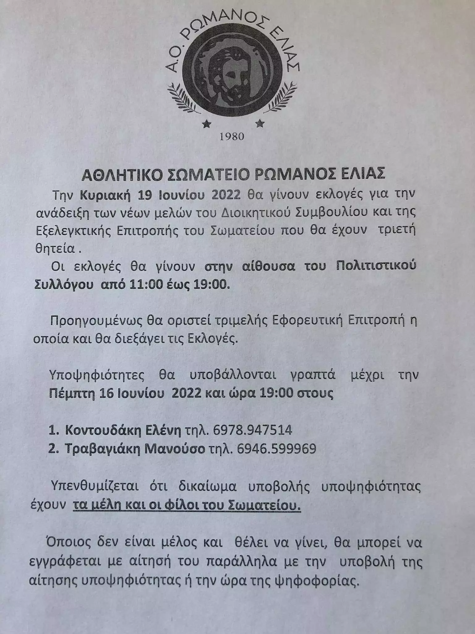 Μάλιστα οι υποψηφιότητες θα υποβάλλονται μέχρι τις 16 Ιουνίου, ενώ δικαίωμα υποβολής υποψηφιότητας θα έχουν τα μέλη και οι φίλοι του σωματείου. Στόχος του Ρωμανού είναι να δυναμώσει το νέο του Δ.Σ. με νέα μέλη και φυσικά να παραμείνουν και οι άνθρωποι που σήκωσαν το… κουπί τα τελευταία χρόνια και έφεραν επιτυχίες στην ομάδα.