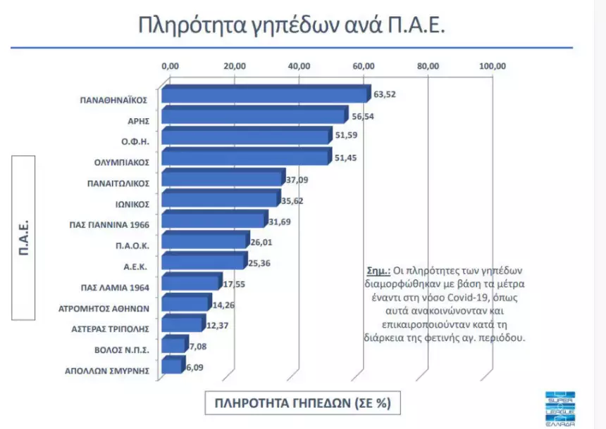 Με ποσοστό 63,52% ο Παναθηναϊκός ηγείται της σχετικής κατάταξης, ενώ ακολουθούν ο Άρης με 56,54% και ο Ο.Φ.Η. με 51,59%. Στον αντίποδα, τη χαμηλότερη πληρότητα εμφανίζουν ο Απόλλωνας Σμύρνης (6,09%), ο Βόλος (7,08%) και ο Αστέρας Τρίπολης (12,37%).