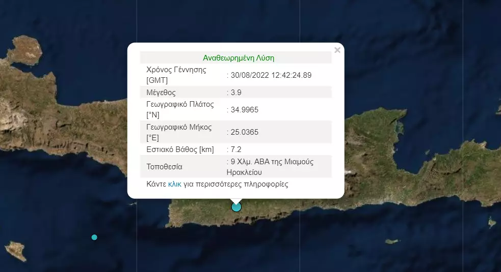 Συγκεκριμένα, η νέα σεισμική δόνηση ήταν εντάσεων 3,9 βαθμών της κλίμακας Ρίχτερ, με εστιακό βάθος τα 7,2 χιλιόμετρα και επίκεντρο 9 χιλιόμετρα ΑΒΑ της Μιαμούς.