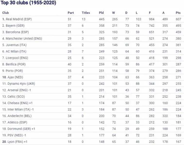 Χρονικά η συγκεκριμένα λίστα που παρουσίασε η UEFA, μέσω της επίσημης ιστοσελίδας της, περιλαμβάνει τα αποτελέσματα και τις παρουσίες των ομάδων από το 1955 ως Κύπελλο Πρωταθλητριών μέχρι το 2020. Στον πίνακα των 526 ομάδων υπάρχει και το ελληνικό στοιχείο καθώς πέντε ελληνικοί σύλλογοι συμπεριλήφθηκαν στη σχετική λίστα.