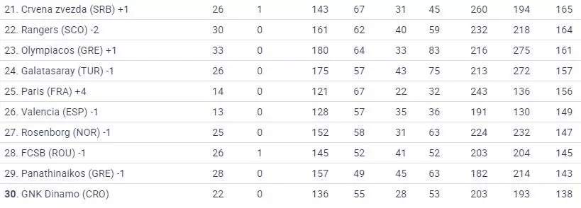 Από την άλλη, η ομάδα του Πειραιά είναι η πρώτη ελληνική που συναντάμε στην 23η θέση της κατάταξης κι αυτό λόγω της μόνιμης παρουσίας του στους ομίλους. Οι «ερυθρόλευκοι» έχουν αγωνιστεί σε 33 σεζόν και 180 αγώνες στους οποίους μετράνε 64 νίκες, 33 ισοπαλίες και 83 ήττες με συντελεστή τερμάτων 216 υπέρ και 275 κατά, ενώ συγκεντρώνει 161 βαθμούς.