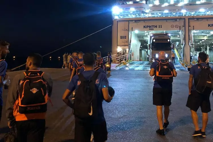 Η «Οδύσσεια» του Αλμυρού ξεκίνησε το βράδυ της Δευτέρας (12/9) όπου στις 21:00 αναχώρησε από το Ηράκλειο με προορισμό στην Αθήνα. Η αποστολή έφτασε σήμερα (13/9) στις 06:00 στο λιμάνι του Πειραιά και θα παραμείνει στο πλοίο μέχρι τις 4 παρά, όπου οι ποδοσφαιριστές θα αναχωρήσουν και θα μεταφερθούν σε ένα άλλο καράβι, το οποίο θα τους μεταφέρει στη Μυτιλήνη.