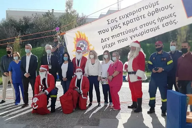 Περίσσεψε η συγκίνηση σήμερα στο Πανεπιστημιακό Νοσοκομείο Ηρακλείου, όπου άνδρες της Πυροσβεστικής, ντυμένοι Άη Βασίληδες, μπήκαν με τα γερανοφόρα οχήματα και με τα σκοινιά τους, και μοίρασαν δώρα στους μικρούς ασθενείς της Παιδοαιματολογικής και Παιδοψυχιατρικής Κλινικής.