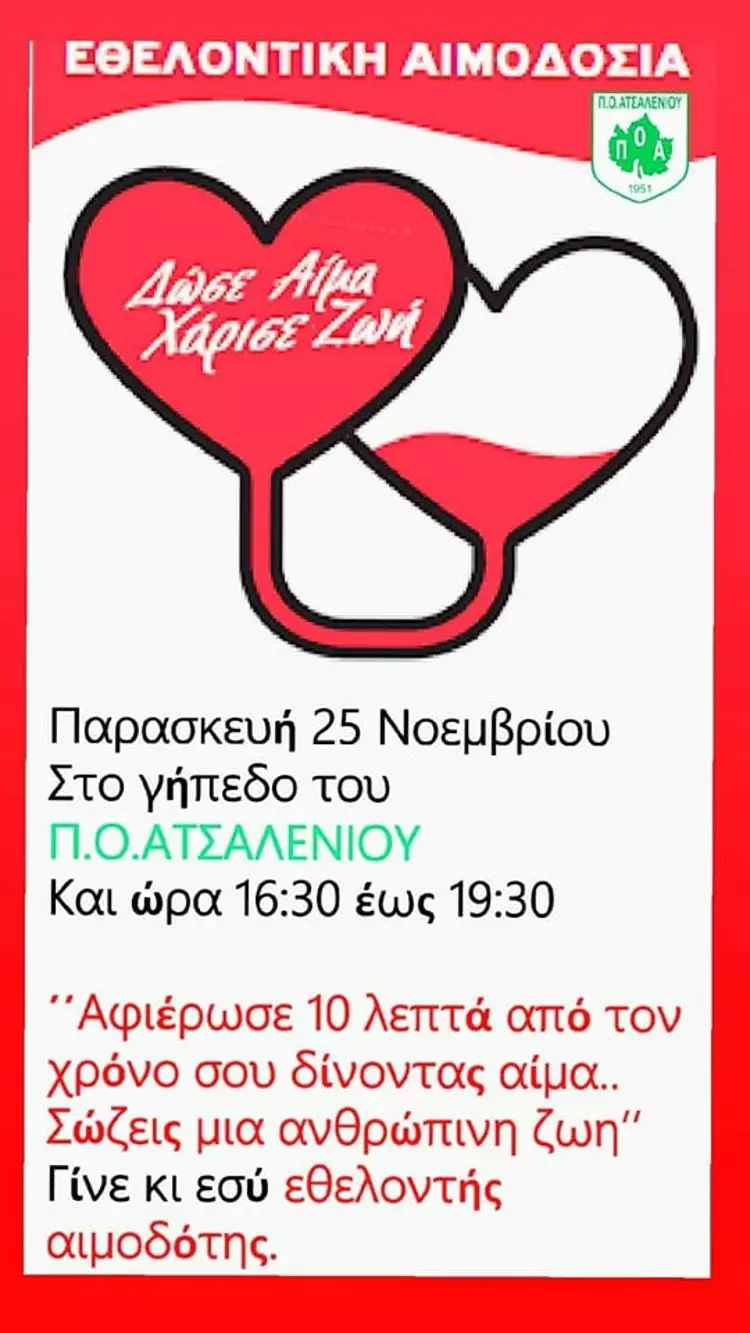 Συγκεκριμένα, στο Ατσαλένιο θα πραγματοποιηθεί εθελοντική αιμοδοσία, από τις 16:30 έως και τις 19:30, την οποία θα συντονίσουν οι άνθρωποι της ομάδας και η κινητή του ΠΑΓΝΗ.