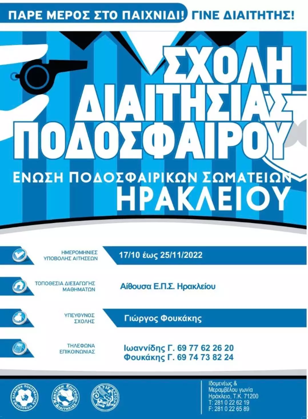 Την έναρξη νέας σχολής διαιτησίας ανακοίνωσε η Ένωση Ποδοσφαιρικών Σωματείων Ηρακλείου!