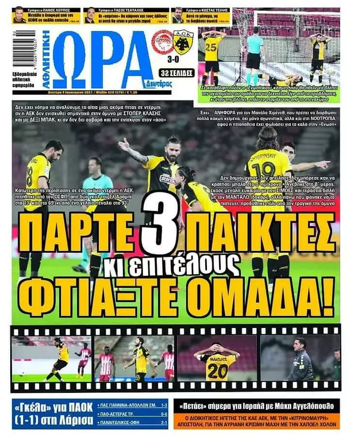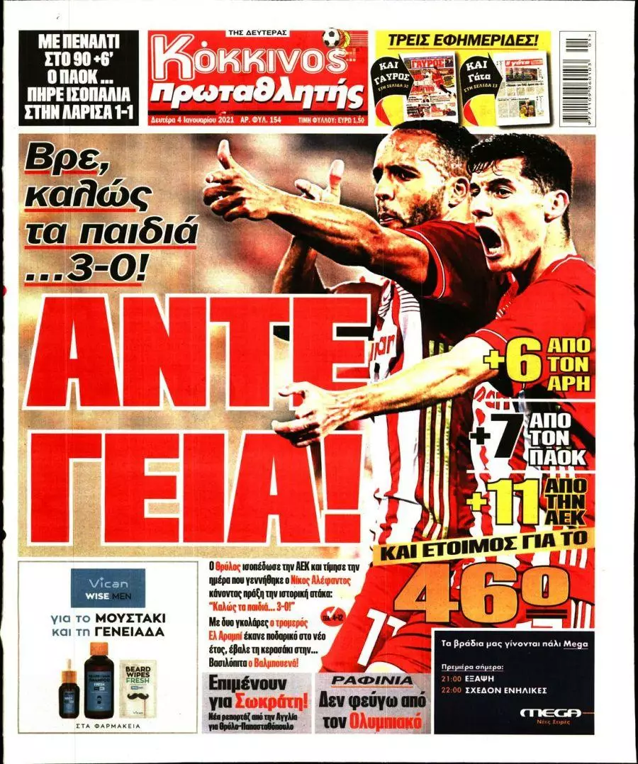 HOT NEWS ΝΙΚΗ-ΑΝΑΣΑ ΟΦΗ ΑΠΙΣΤΕΥΤΗ ΕΝΤΑΣΗ ΣΤΟ ΝΤΕΡΜΠΙ ΑΠΟΤΕΛΕΣΜΑΤΑ ΣΑΒΒΑΤΟΥ Α1 ΕΠΣΗ: ΤΕΡΑΣΤΙΕΣ ΝΙΚΕΣ ΓΙΑ ΧΕΡΣΟΝΗΣΟ ΚΑΙ ΛΙΝΤΟ ΕΠΙΣΤΡΟΦΗ ΙΣΕΚΑ ΣΤΟΝ ΟΦΗ ΕΦΗΜΕΡΙΔΕΣΚΥΡΙΕΣ ΕΙΔΗΣΕΙΣ Τα πρωτοσέλιδα των αθλητικών εφημερίδων(04/01) Δημοσιογραφικό Τμήμα 04/01/2021 - 08:39 FacebookTwitterWhatsAppLinkedinEmailΤυπώνωCopy URL Δείτε παρακάτω τα πρωτοσέλιδα των αθλητικών εφημερίδων για σήμερα Δευτέρα 4 Ιανουαρίου. ΔΙΑΒΑΣΤΕ ΕΠΙΣΗΣ: Αστέρας Μυρτιάς-Φαιστός 5-2: Τα highlights του αγώνα (vid) Β. Ανυφαντάκης: «Μέσα από τα παιχνίδια αλλάζουμε τη νοοτροπία μας» ΟΦΗ-Πανσερραϊκός 3-0: Τα highlights του αγώνα (vid) Τα αποτελέσματα στους αγώνες του Σαββάτου (13/12) και το πρόγραμμα της Κυριακής (14/12) Πρωτοφανής ένταση και τέσσερις αποβολές στο Χερσόνησος–Εργοτέλης! Α1 ΕΠΣΗ: Έβαλε φωτιά στο πρωτάθλημα η Χερσόνησος, μεγάλες νίκες για ΑΕΚ, Λίντο και Μινωική ΡΟΗ ΕΙΔΗΣΕΩΝ ΕΡΓΟΤΕΛΗΣ Η στιγμή της κουτουλιάς του Ηλία Κώτσιου στον Δημήτρη Μηλάκη! (vid) Κώστας Μεταξάκης 13/12/2025 23:48 ΑΣΤΕΡΑΣ ΜΥΡΤΙΑΣ Αστέρας Μυρτιάς-Φαιστός 5-2: Τα highlights του αγώνα (vid) Δημοσιογραφικό Τμήμα 13/12/2025 23:35 ΡΩΜΑΝΟΣ Β. Ανυφαντάκης: «Μέσα από τα παιχνίδια αλλάζουμε τη νοοτροπία μας» Δημήτρης Γιγουρτσής 13/12/2025 22:35 ΟΦΗ ΟΦΗ-Πανσερραϊκός 3-0: Τα highlights του αγώνα (vid) Δημήτρης Γιγουρτσής 13/12/2025 21:48 Α1 ΕΠΣΗ Τα αποτελέσματα στους αγώνες του Σαββάτου (13/12) και το πρόγραμμα της Κυριακής (14/12) Δημοσιογραφικό Τμήμα 13/12/2025 21:20 Β ΕΠΣΗ Β2 ΕΠΣΗ: Ισόπαλο το ντέρμπι κορυφής, νίκες για Τηγανίτη και Ατρόμητος Επισκοπής Δημήτρης Γιγουρτσής 13/12/2025 21:16 ΓΑΡΙΠΑ Μοιρασιά από την άσπρη βούλα για Γαρίπα και Δωριέα Δημήτρης Γιγουρτσής 13/12/2025 21:09 Όλες οι ειδήσεις ΔΗΜΟΦΙΛΗ Α1 ΕΠΣΗ Τα αποτελέσματα στους αγώνες του Σαββάτου (13/12) και το πρόγραμμα της Κυριακής (14/12) ΕΡΓΟΤΕΛΗΣ Πρωτοφανής ένταση και τέσσερις αποβολές στο Χερσόνησος–Εργοτέλης! Α1 ΕΠΣΗ Α1 ΕΠΣΗ: Έβαλε φωτιά στο πρωτάθλημα η Χερσόνησος, μεγάλες νίκες για ΑΕΚ, Λίντο και Μινωική ΕΡΓΟΤΕΛΗΣ Ηλ. Κώτσιος: «Υπάρχει μένος απέναντι στον Εργοτέλη, με 11 παίκτες δεν υπήρχε περίπτωση να μην κερδίσουμε» (vid) ΧΕΡΣΟΝΗΣΟΣ Άδικη και ακατανόητη αποβολή για τον Λουμπάκη!