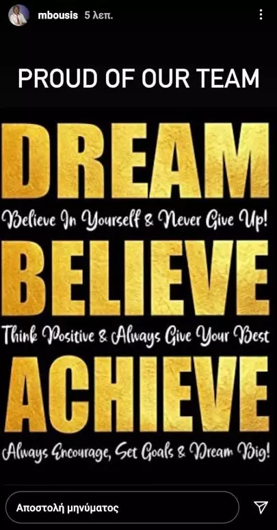 Στην φωτογραφία που ανάρτησε ο μεγαλομέτοχος του ΟΦΗ, γράφει παράλληλα, «πίστεψε στον εαυτό σου και ποτέ μην τα παρατήσεις», «σκέψου θετικά και πάντα δώσε το καλύτερο σου» και «πάντα να έχεις κουράγιο, να ορίζεις στόχους και να έχεις υψηλά όνειρα», ενώ με μεγάλα γράμματα αναγράφονται οι λέξεις, «ονειρέψου», «πίστεψε» και «πέτυχε»