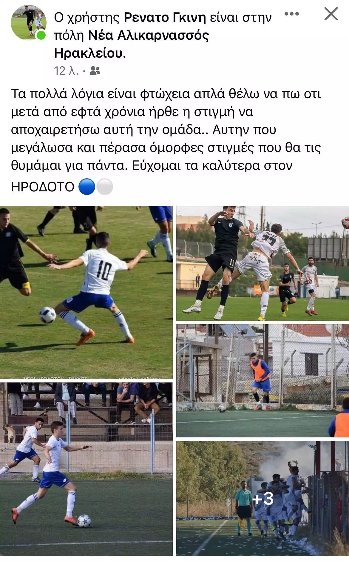 Ο Ρενάτο Γκίνη μετά από επτά ολόκληρα χρόνια με τη φανέλα του Ηροδότου, έχοντας ζήσει σπουδαίες στιγμές στη Νέα Αλικαρνασσό αποχαιρέτησε την ομάδα, με μια ανάρτηση του στα social media.