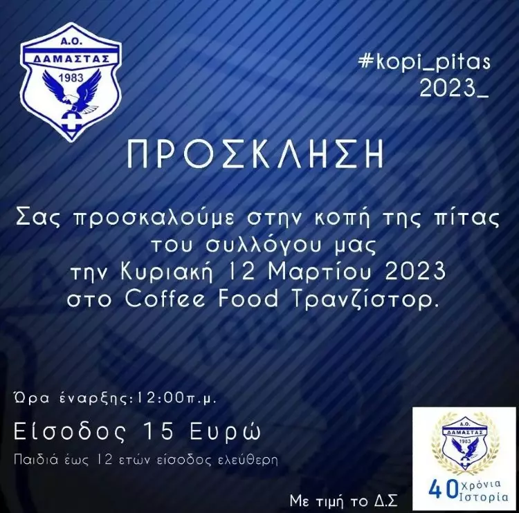 Η ανακοίνωση αναφέρει: «Ο Αθλητικός Όμιλος Δαμάστας σας καλεί στην κοπή της πίτας του η οποία θα πραγματοποιηθεί την Κυριακή 12 Μαρτίου 2023 στο ΚΟΦΙ ΦΟΥΝΤ ΤΡΑΝΖΊΣΤΟΡ στην πλατεία της Αγίας Μαρίνας.