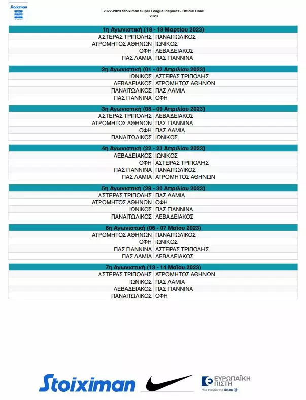 Ανακοινώθηκε το πλήρες… μενού των εφτά αγωνιστικών, στη… μάχη της σωτηρίας στη Super League. O ΟΦΗ, στο πλαίσιο της 1ης αγωνιστικής, φιλοξενεί τον Λεβαδειακό, ενώ στη συνέχεια αντιμετωπίζει ΠΑΣ Γιάννινα (εκτός), Λαμία (εντός), Αστέρα Τρίπολης (εντός), Ατρόμητο (εκτός), Ιωνικό (εντός) και Παναιτωλικό (εκτός). Η πρεμιέρα έχει οριστεί το ερχόμενο σαββατοκύριακο (18-19/03), ενώ η διαδικασία ολοκληρώνεται το διήμερο 13-14 Μαΐου. Αναλυτικά: