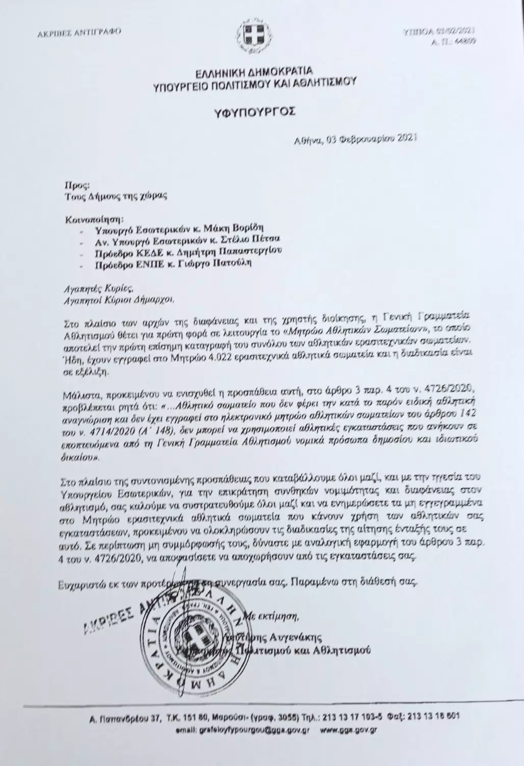 Δείτε παρακάτω το έγγραφο που απέστειλε ο Λευτέρης Αυγενάκης προς τους Δήμους της χώρας: