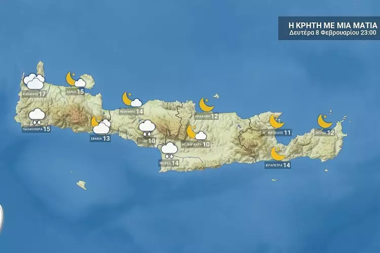 Συννεφιά και βροχοπτώσεις σε ορισμένες περιοχές της Κρήτης θα έχουμε αύριο (08/02) στο νησί μας. Παρακολουθείστε τον καιρό της Δευτέρας, 8 Φεβρουαρίου, στην Κρήτη.