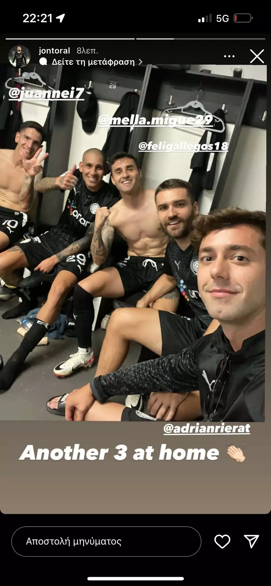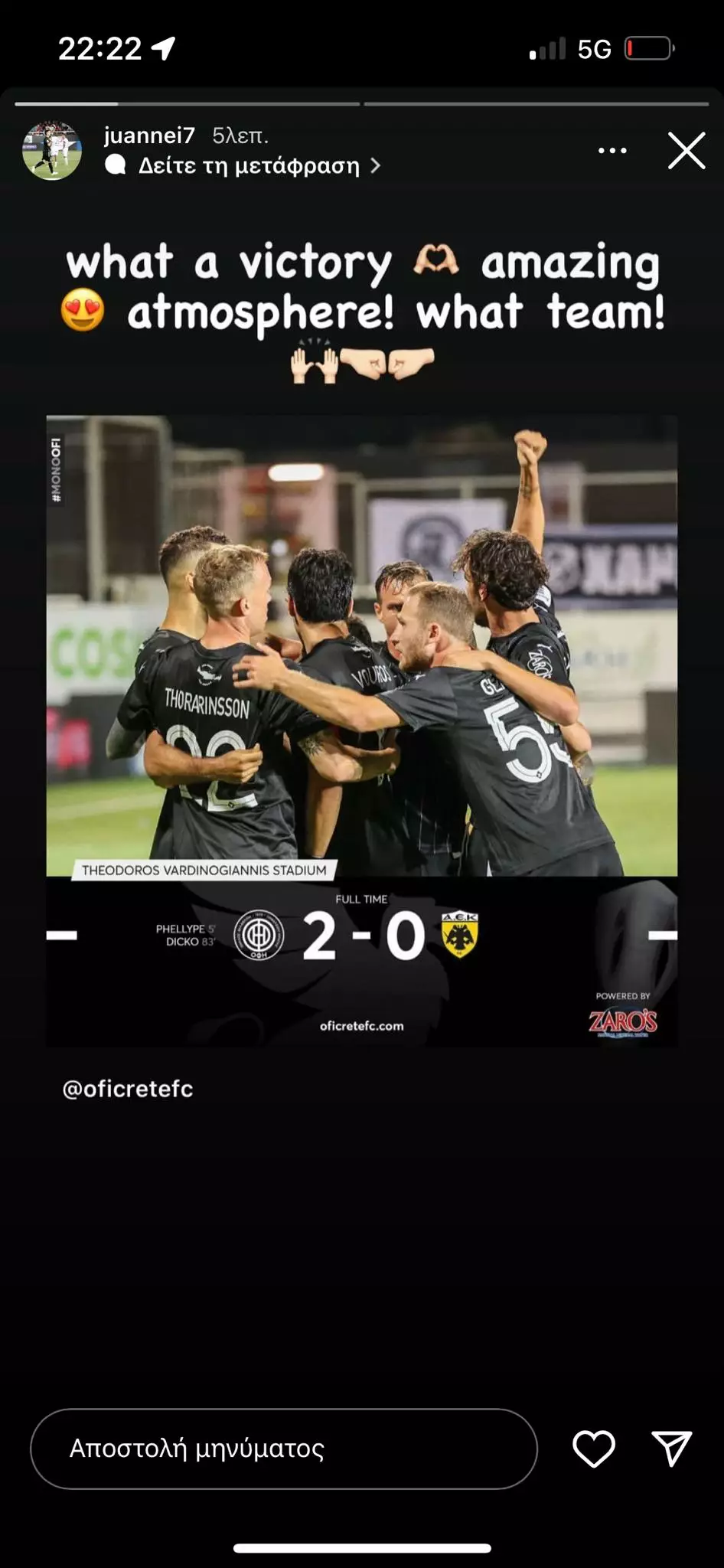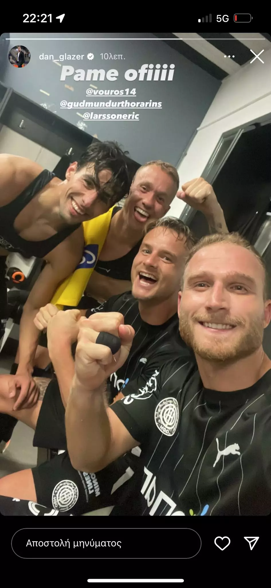 Συγκεκριμένα ο Νταν Γκλάζερ με Instagram story, παρέα με τους Βούρο, Λάρσον και Τοράρινσον, γράφει «Πάμε ΟΦΗ» σε πανηγυρικό κλίμα, ο Γιόν Τοράλ μαζί με τους… λατίνους Νέιρα, Μεγιάδο, Ριέρα και Γκαγιέγος το γιορτάζει γράφωντας «Ακόμα ένα τρίποντο στο σπίτι μας», ενώ ο «μάγος» του ΟΦΗ, Χουάν Νέιρα επίσης σε story του έγραψε: «Τι νίκη! Απίθανη ατμόσφαιρα, τι ομάδα!»