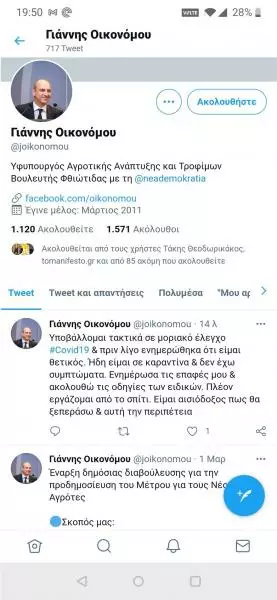 «Ήδη είμαι σε καραντίνα & δεν έχω συμπτώματα. Ενημέρωσα τις επαφές μου & ακολουθώ τις οδηγίες των ειδικών. Πλέον εργάζομαι από το σπίτι. Είμαι αισιόδοξος πως θα ξεπεράσω & αυτή την περιπέτεια» ανέφερε ακόμη ο υπουργός.