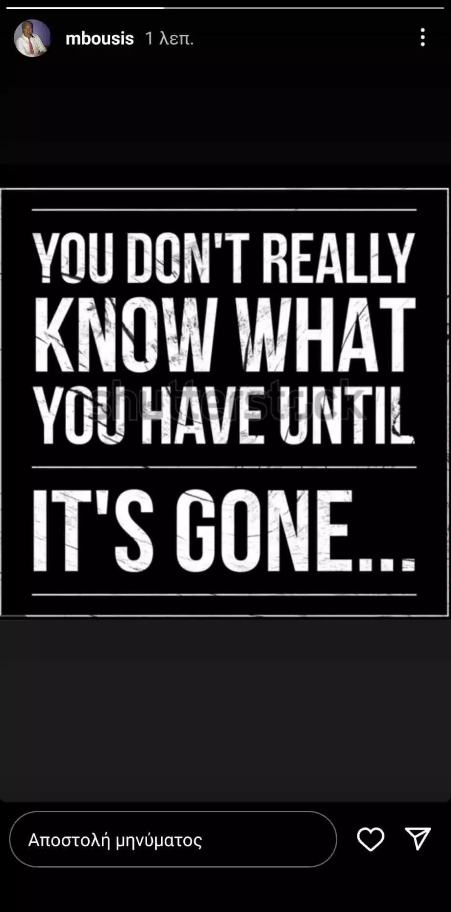 Μάλιστα ο Μιχάλης Μπούσης ανέβασε και ένα αινιγματικό Instagram Story οπού γράφει: «Δεν ξέρεις τι πραγματικά έχεις, μέχρι να χαθεί».