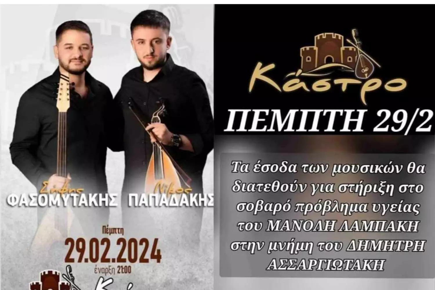 Οι δύο μουσικοί διοργανώνουν την Πέμπτη 29 Φεβρουαρίου στο «Κάστρο» μία όμορφη εκδήλωση για να στηριχτεί ο μαχητής ποδοσφαιριστής του Ποσειδώνα. Τα έσοδα των μουσικών θα διατεθούν για την στήριξη στο σοβαρό πρόβλημα υγείας του Μανώλη Λαμπάκη, στη μνήμη του Δημήτρη Ασσαργιωτάκη.