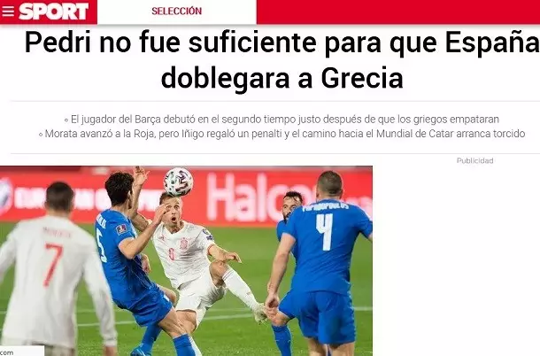 Mundo Deportivo: «Η Ισπανία αρχίζει τον δρόμο προς το Κατάρ με ισοπαλία κόντρα στην Ελλάδα. Η Ισπανία δεν ήταν ο τυφώνας που διέλυσε τους Γερμανούς και η Ελλάδα δεν έδωσε τις ίδιες ευκολίες».