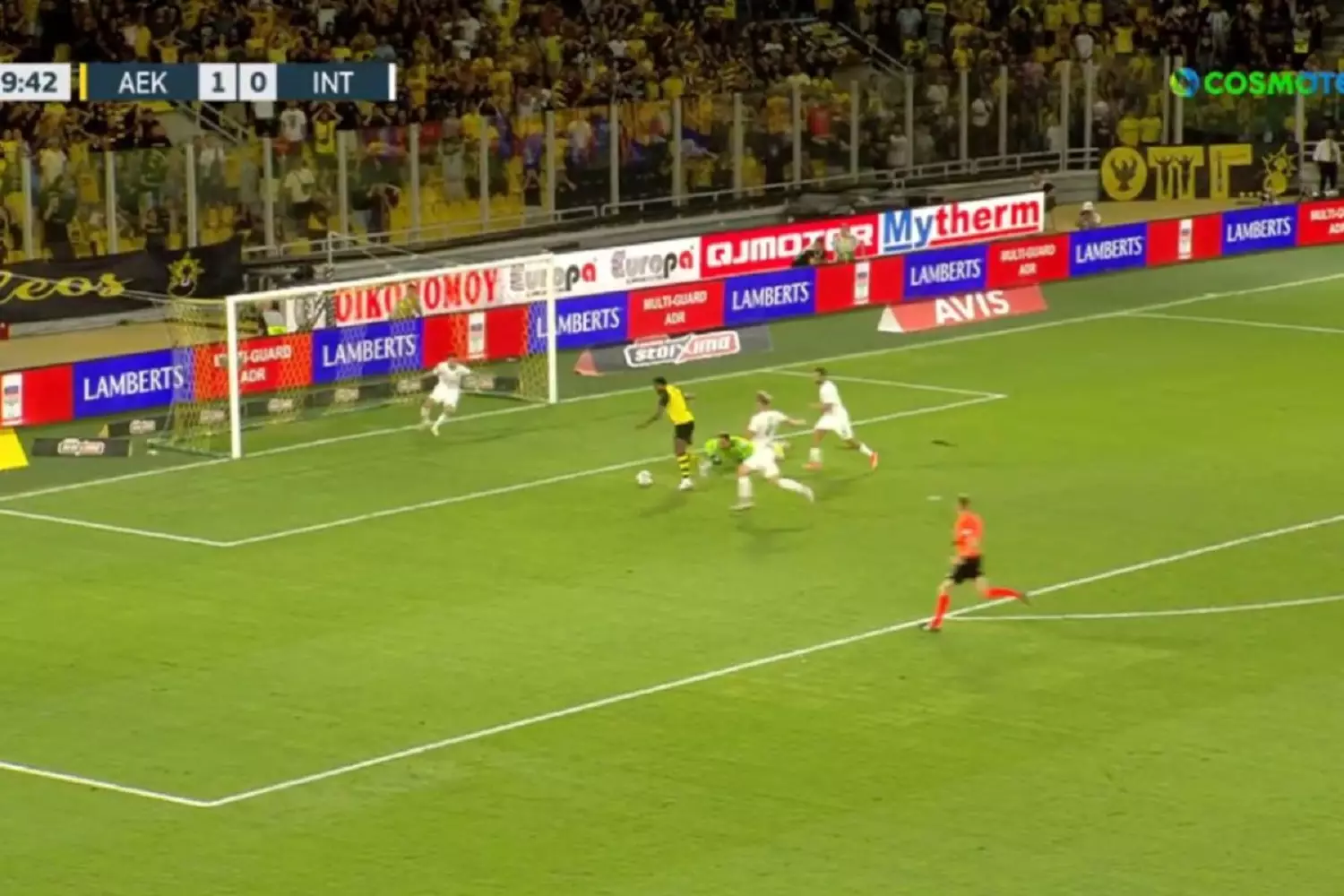 Η ΑΕΚ έκανε το 2-0 απέναντι στην Ίντερ Εσκάλδες, καθώς μετά από βαθιά μπαλιά του Θωμά Στρακόσα, ο Λιβάι Γκαρσία βγήκε τετ α τετ και με τη δεύτερη σκόραρε.