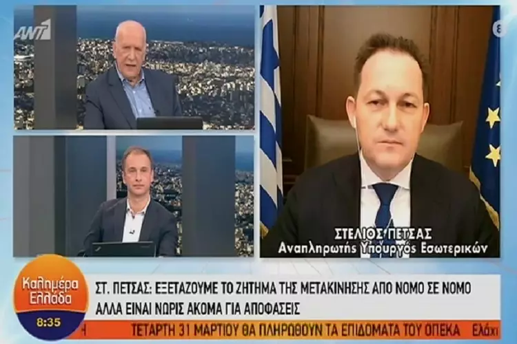 Στην εκπομπή Καλημέρα Ελλάδα μίλησε ο Αναπληρωτής Υπουργός Εσωτερικών, Στ. Πέτσας, για τις διαδημοτικές μετακινήσεις, τις μετακινήσεις από νομό σε νομό, το Πάσχα, τους σεισμόπληκτους στην Ελασσόνα και την στήριξη της εστίασης.