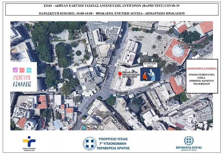 Οι δειγματοληψίες θα διεξαχθούν στην Ενετική Λότζια- Δημαρχείο Ηρακλείου, από τις 10:00 έως τις 14:00, όπως απεικονίζεται στον επισυναπτόμενο χάρτη. Η προσέλευση του κοινού που επιθυμεί να υποβληθεί στο τεστ είναι ελεύθερη.