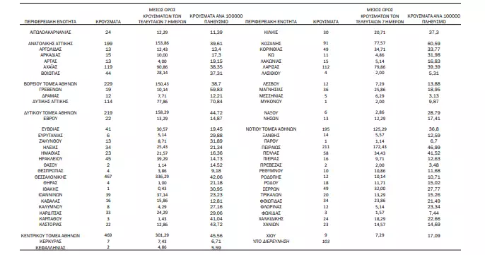 Πιο συγκεκριμένα το Ηράκλειο βρίσκεται ξανά στην κορυφή με 45, ενώ πολύ πίσω είναι τα Χανιά στην δεύτερη θέση με 23. Τρίτος νομός με τα περισσότερα κρούσματα είναι το Ρέθυμνο με 10, ενώ μόλις 4 εντοπίστηκαν στο Λασίθι.