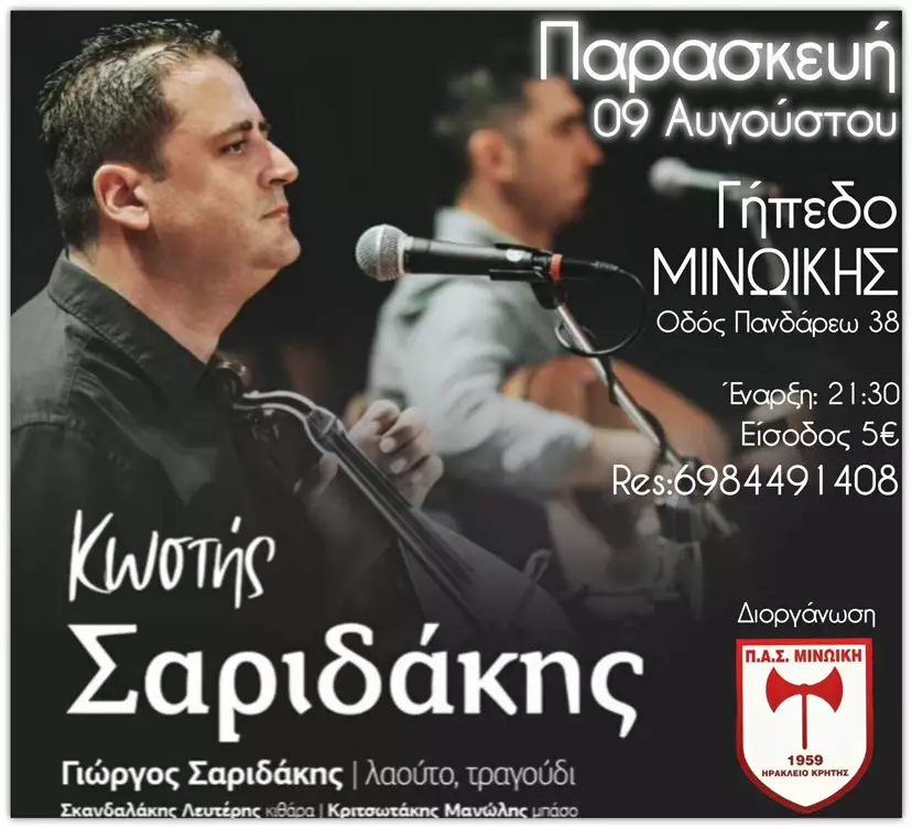 Η Μινωική οργανώνει απόψε στις 21:30 μουσική βραδιά με τον Κώστα Σαριδάκη, στο γήπεδο της ομάδας (Οδός Πανδάρεω 38), σε μία βραδιά που η διασκέδαση αναμένεται να απογειωθεί στα ύψη!