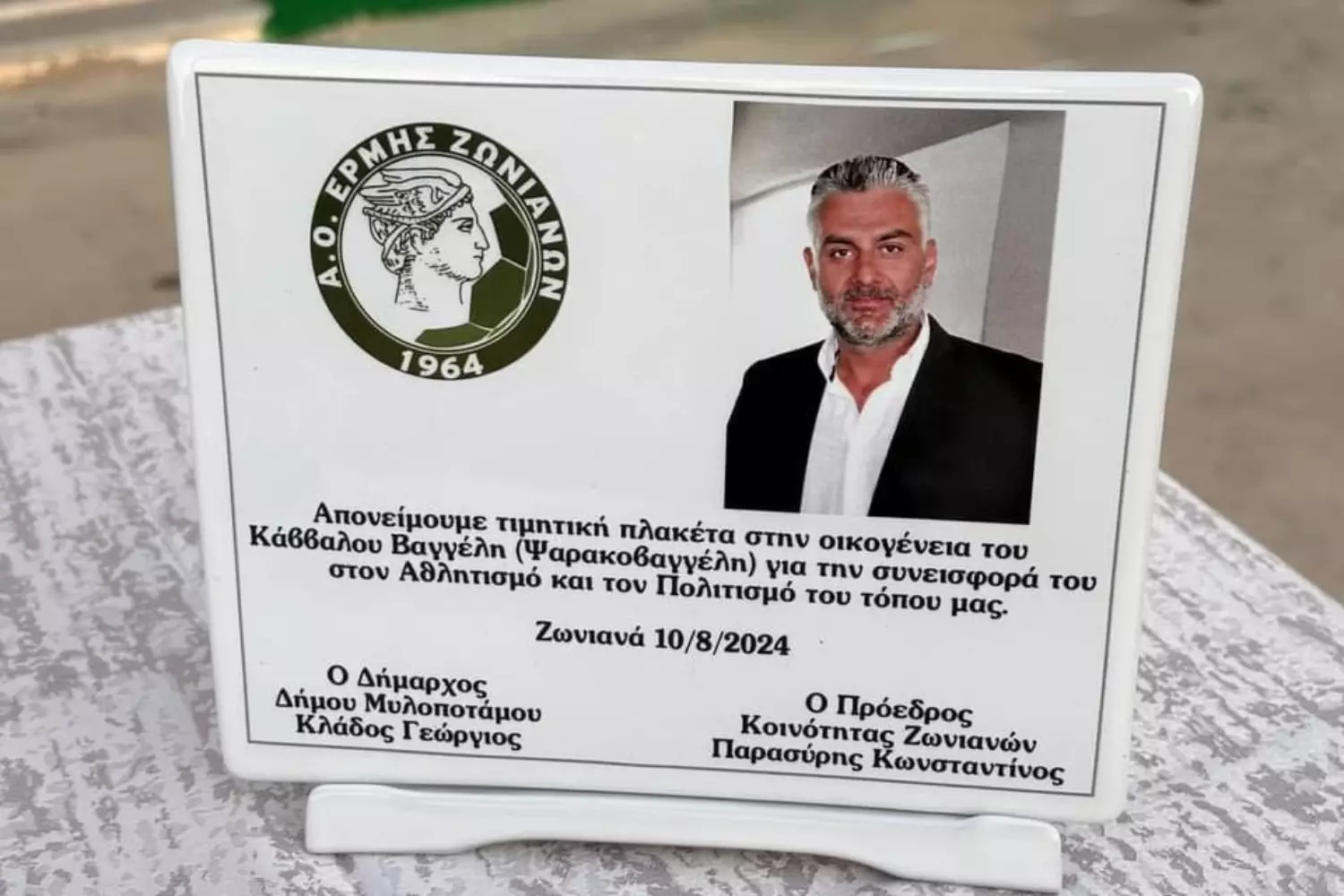 Μάλιστα ο Δήμαρχος Μυλοποτάμου, Γιώργος Κλάδος και ο πρόεδρος της κοινότητας Ζωνιανών, Κώστας Παρασύρης, απένειμαν τιιμητική πλακέτα στην οικογένιεα του Β. Κάββαλου, για τη μεγάλη του συνεισφορά στον αθλητισμό και τον πολιτισμού του τόπου.