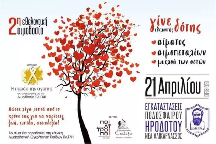 Συγκεκριμένα την Τετάρτη 21 Απριλίου θα πραγματοποιηθεί εθελοντική αιμοδοσία στις εγκαταστάσεις της ομάδας της Αλικαρνασσού και όσα φιαλίδια μαζευτούν θα δοθούν στην Παιδοογκολογική Κλινική του ΠΑΓΝΗ.