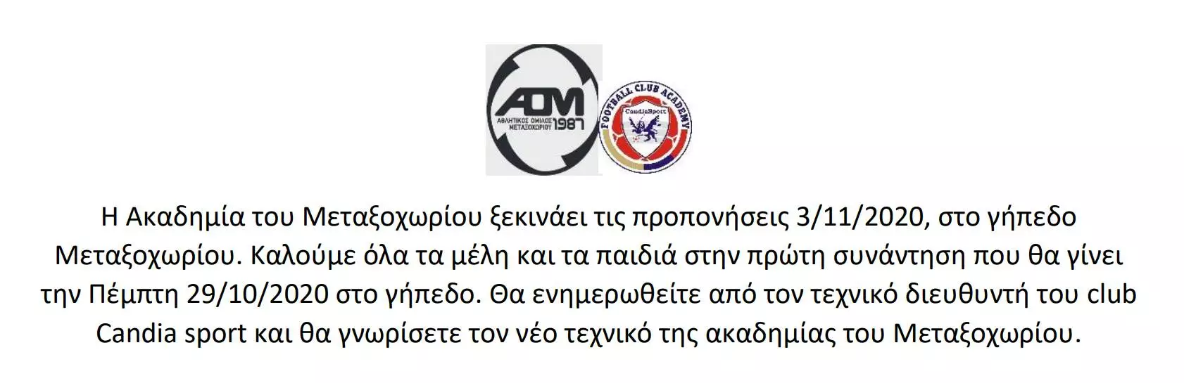 Η πρώτη συνάντηση θα γίνει την Πέμπτη, 29 Οκτωβρίου, στο γήπεδο της ομάδας, εκεί όπου θα ενημερωθούν από τον Τεχνικό Διευθυντή του Candia Sport και θα γνωρίσουν τον νέο προπονητή της ακαδημίας.