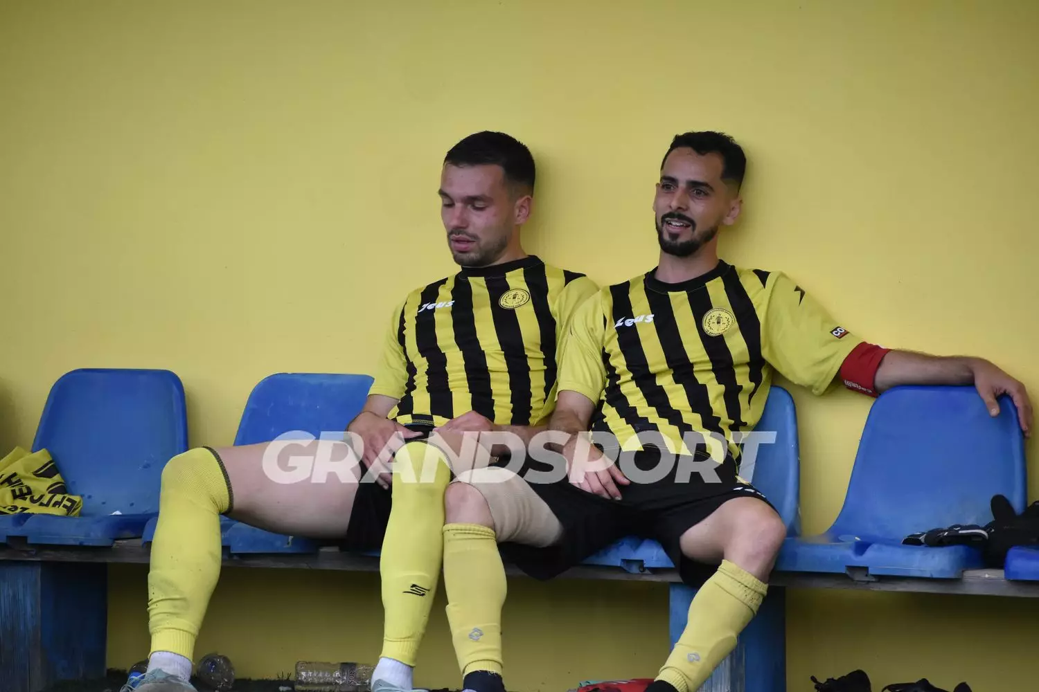 Μυρώς Γιακουμάκης και Απόστολος Δουλγεράκης, λίγα λεπτά μετά το τέλος της αναμέτρησης στον Μοχό, κάθονται εξαντλημένοι στον πάγκο, χωρίς δυνάμεις ούτε καν για να πανηγυρίσουν.