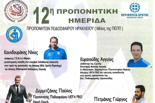 Μια ξεχωριστή ημερίδα αφιερωμένη στην προπονητική και την τακτική στο ποδόσφαιρο πρόκειται να πραγματοποιηθεί την Κυριακή, 8 Μαρτίου, στο ξενοδοχείο VANISKO στο Ηράκλειο, με τη συνδιοργάνωση του Συνδέσμου Προπονητών Ποδοσφαίρου Ηρακλείου και της Περιφέρειας Κρήτης.
