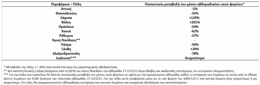Αναλυτικά η ενημέρωση του ΕΟΔΥ: «Ανακοινώνονται τα αποτελέσματα των εργαστηριακών ελέγχων του Εθνικού Δικτύου Επιδημιολογίας Λυμάτων για την επιδημιολογική επιτήρηση του ιού SARS-CoV-2 σε αστικά λύματα, το οποίο λειτουργεί υπό το συντονισμό του ΕΟΔΥ. Τα αποτελέσματα αφορούν στην εβδομάδα 17 έως 23 Μαΐου 2021.