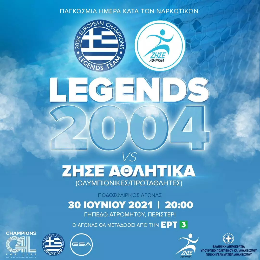 Ποδοσφαιρικός αγώνας την προσεχή Τετάρτη στο Περιστέρι, μεταξύ των «Legends 2004» και Ολυμπιονικών που συμμετέχουν στο καινοτόμο πρόγραμμα του Υφυπουργείου Αθλητισμού, αφιερωμένος στην Παγκόσμια Ημέρα κατά των Ναρκωτικών