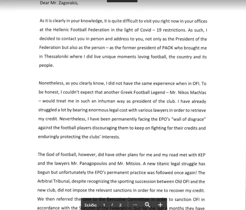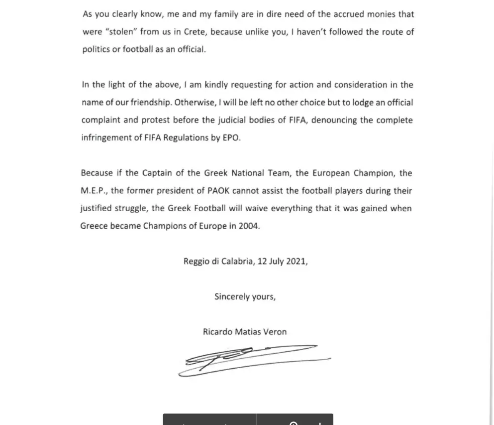 Πλέον ο ίδιος απευθύνεται στον Πρόεδρο της ΕΠΟ, με επίσημη επιστολή και του ζητάει να παρέμβει, ενώ όπως αναφέρει σε αντίθεση περίπτωση θα στείλει επίσημα τα «παράπονά» του προς την Φίφα και την Ουέφα.