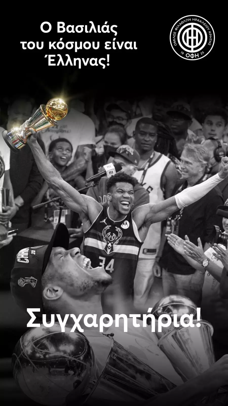 Τα δικά του συγχαρητήρια στον Γιάννη Αντετοκούμπο έστειλε ο ΟΦΗ, με μία υπέροχη φωτογραφία που δείχνει τον Greek Freak με το τρόπαιο του πρωταθλητή στο χέρι!