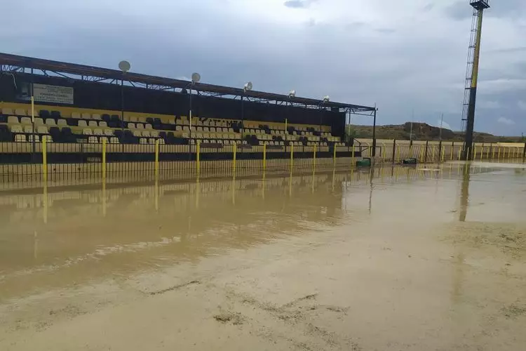 Το μεσημέρι της ίδιας ώρας, η βροχή έγινε εντονότερη, ο ποταμός που περνάει δίπλα από το γήπεδο πλημμύρισε, με συνέπεια να πλημμυρίσει και το γήπεδο, το οποίο πλέον μοιάζει περισσότερο με λασπότοπο παρά με ποδοσφαιρικό γήπεδο!