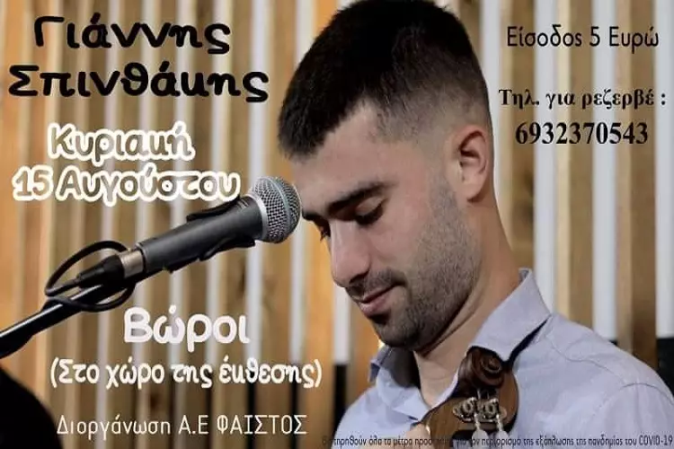 Η είσοδος θα είναι 5 ευρώ και οι άνθρωποι της Φαιστού θα τηρήσουν αυστηρά όλα τα μέτρα κατά του κορωνοϊού. Άπαντες περιμένουν τους φίλους της ομάδας και όχι μόνο να βρεθούν στην εκδήλωση και να περάσουν ένα ξεχωριστό βράδυ με τον Γιάννη Σπινθάκη.