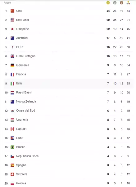 Παραμένει στην 1η θέση του Ranking με περισσότερα μετάλλια η ΗΠΑ. Πρώτη στα χρυσά η Κίνα. Στην 32η θέση της συνολικής κατάταξης η Ελλάδα.